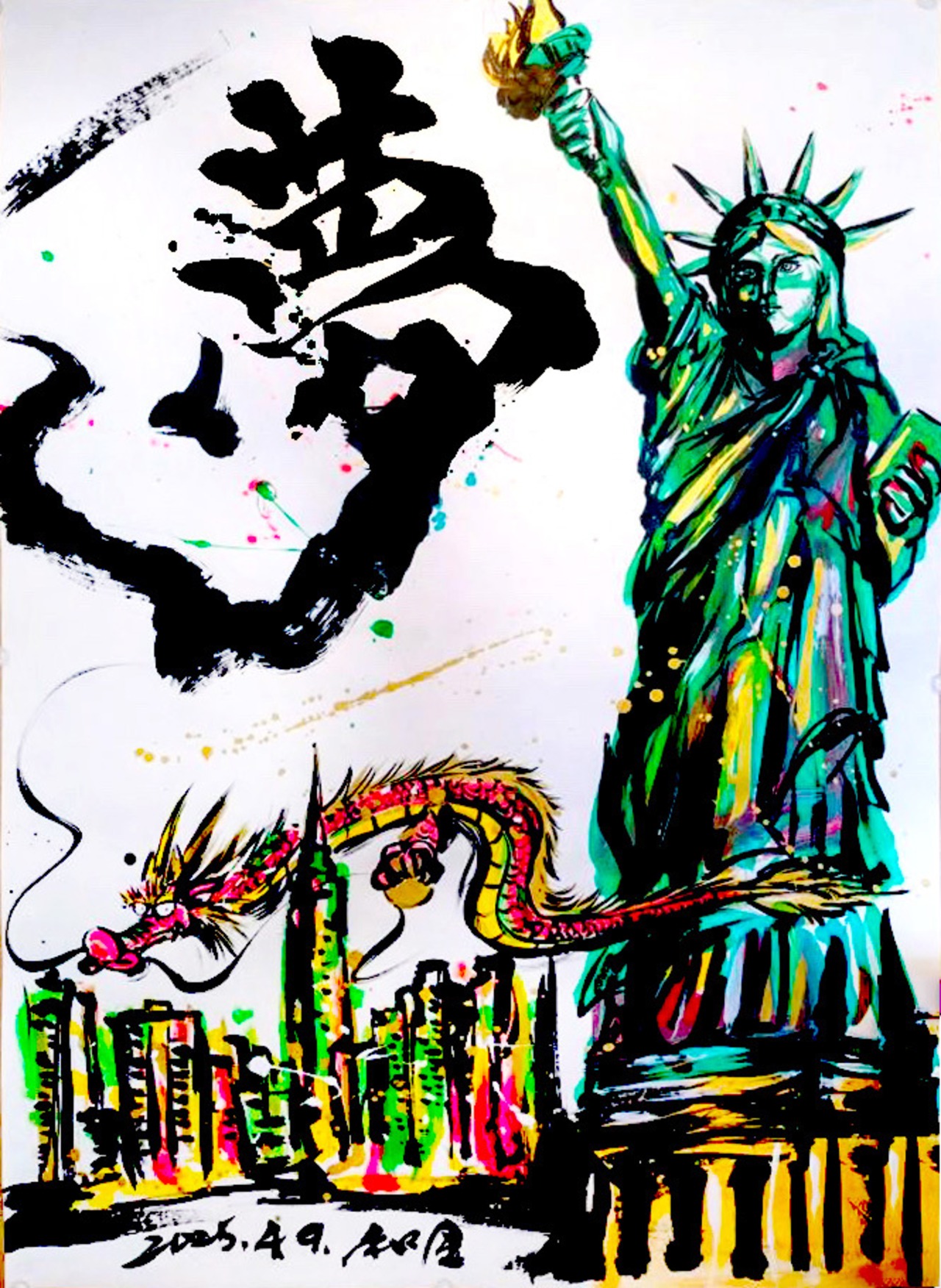 ニューヨークの象徴的な要素を一つに集めた「ニューヨークパフォーマンス作品」。自由の女神、龍、そしてそびえ立つビル群を描いたこの作品は、ニューヨークのエネルギーと情熱を表現しています。ちょうど桜の季節に書くことができた作品。夢を叶えるために世界中から集まった人のエネルーが渦巻いてるニューヨークを表現しました。これは、帰国して再度パフォーマンスした時の作品